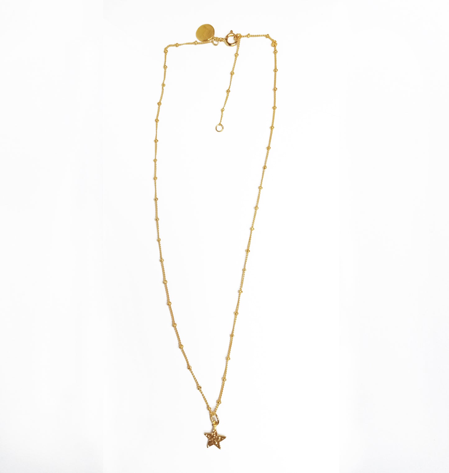 Adorable and simply elegant, single star on a sterling silver hand made bobble necklace with extender and Franki signature logo tag, plated in 18kt gold. This is one of our favourite pieces and women all ages love it.