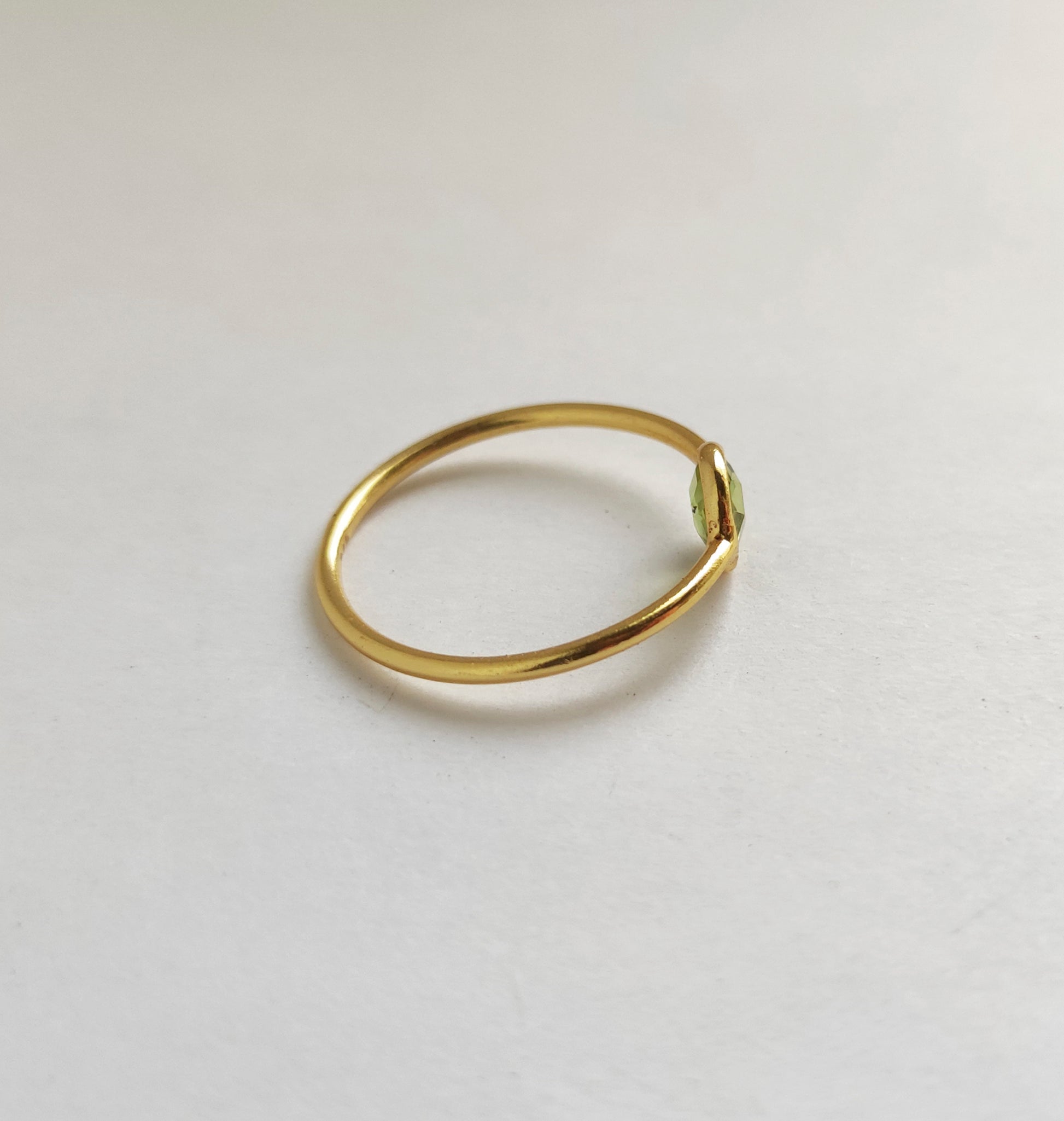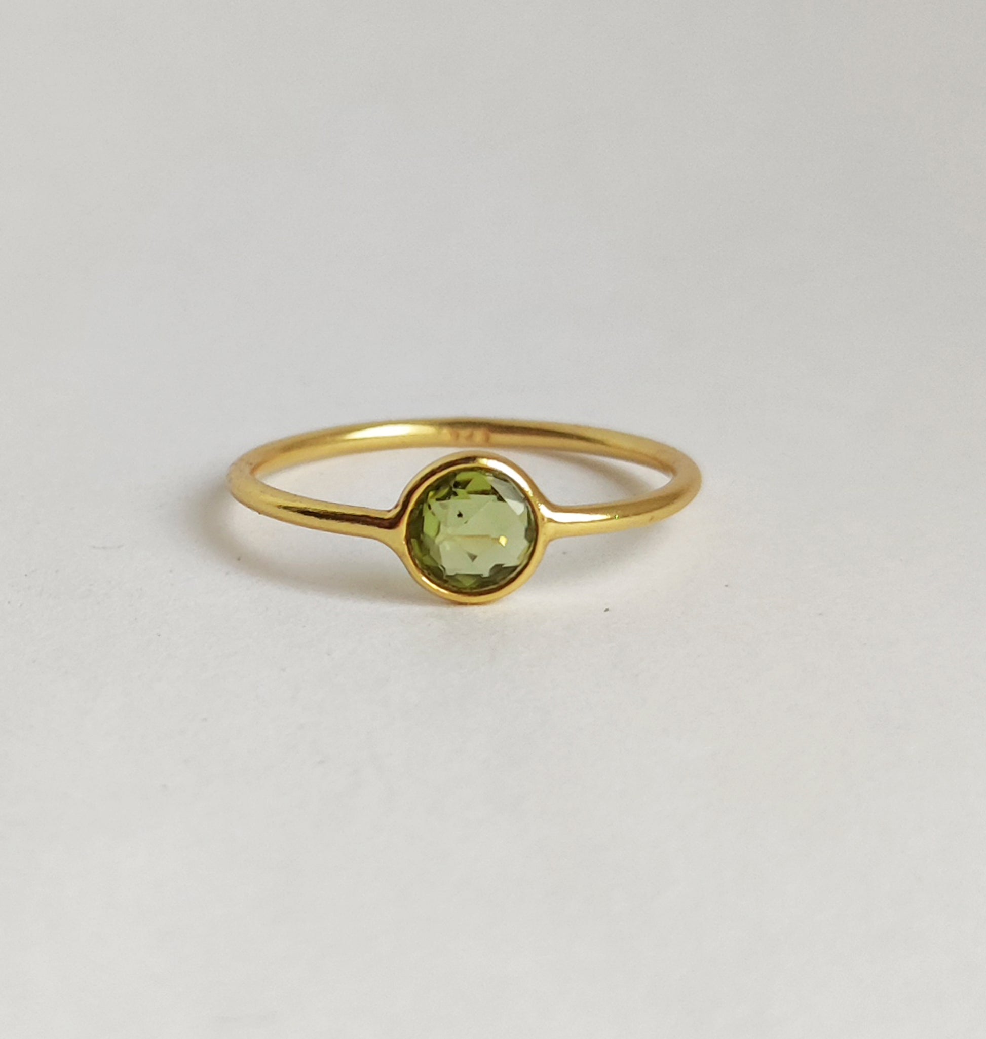 Elevate your jewelry collection with the Peridot dainty gold stacking ring. Crafted from sterling silver 925 and finished with an 18kt gold plate, this thin, lightweight ring offers a comfortable fit for everyday wear. Featuring a vibrant green peridot stone, it's perfect for layering or wearing solo. Its simple, elegant design makes it an ideal gift for a 21st birthday or a cherished addition to your wardrobe. Enhance your style effortlessly with this timeless, versatile stacking ring.