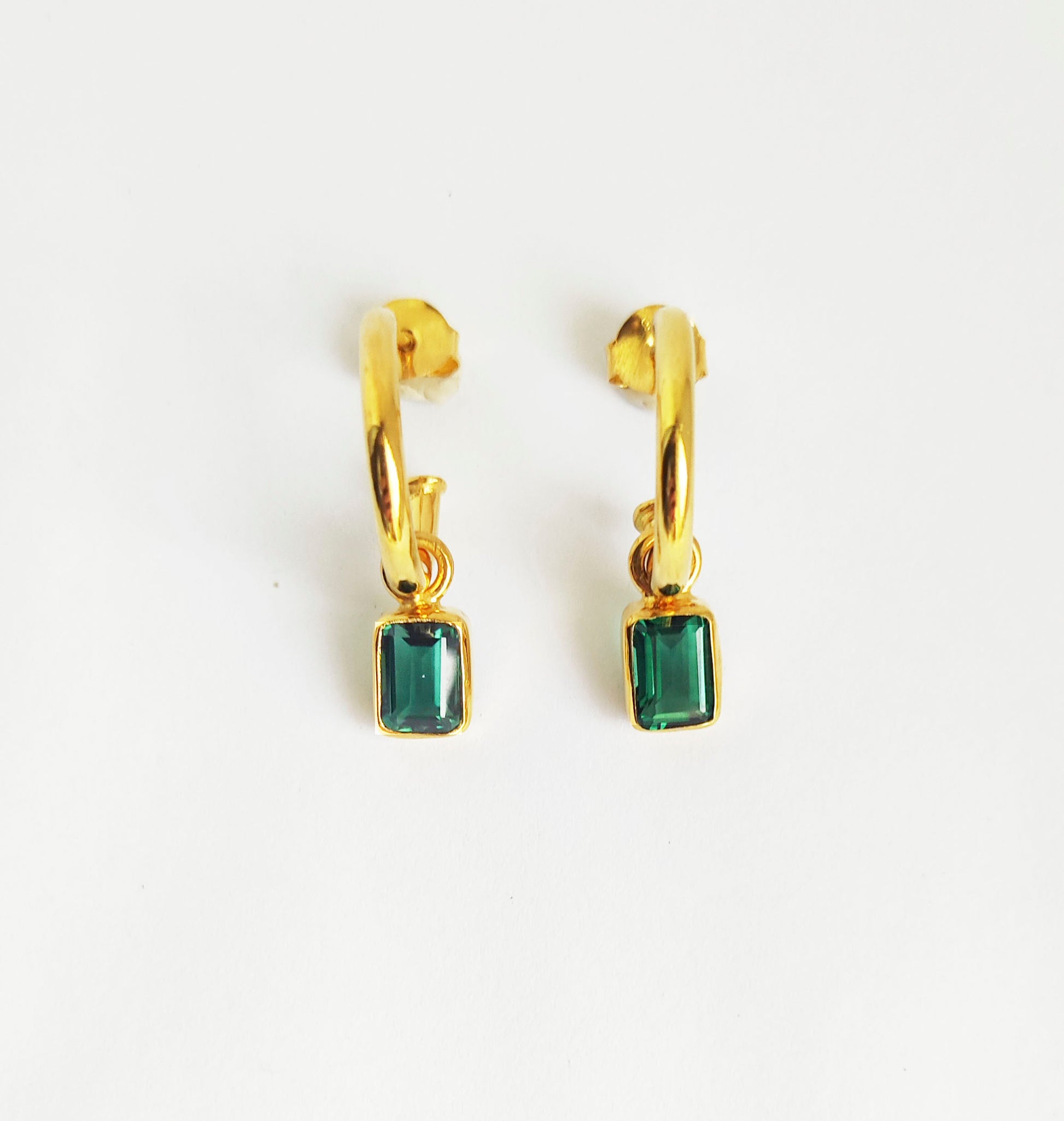 Emerald green and emerald cut gold huggie goops with dangle charms that are interchangable are all en vogue right now. The colour for the season and for popping every outfit day and night.