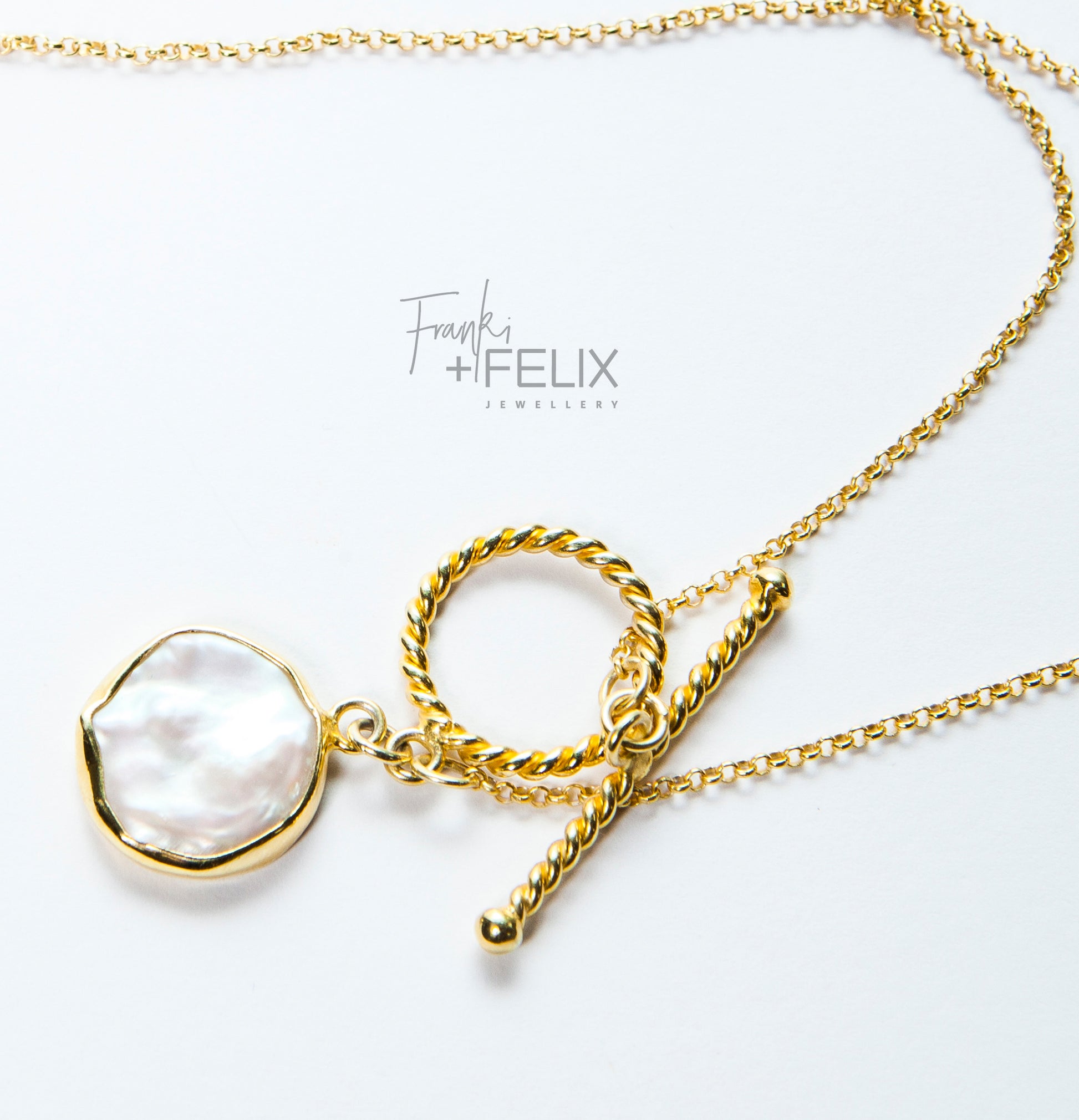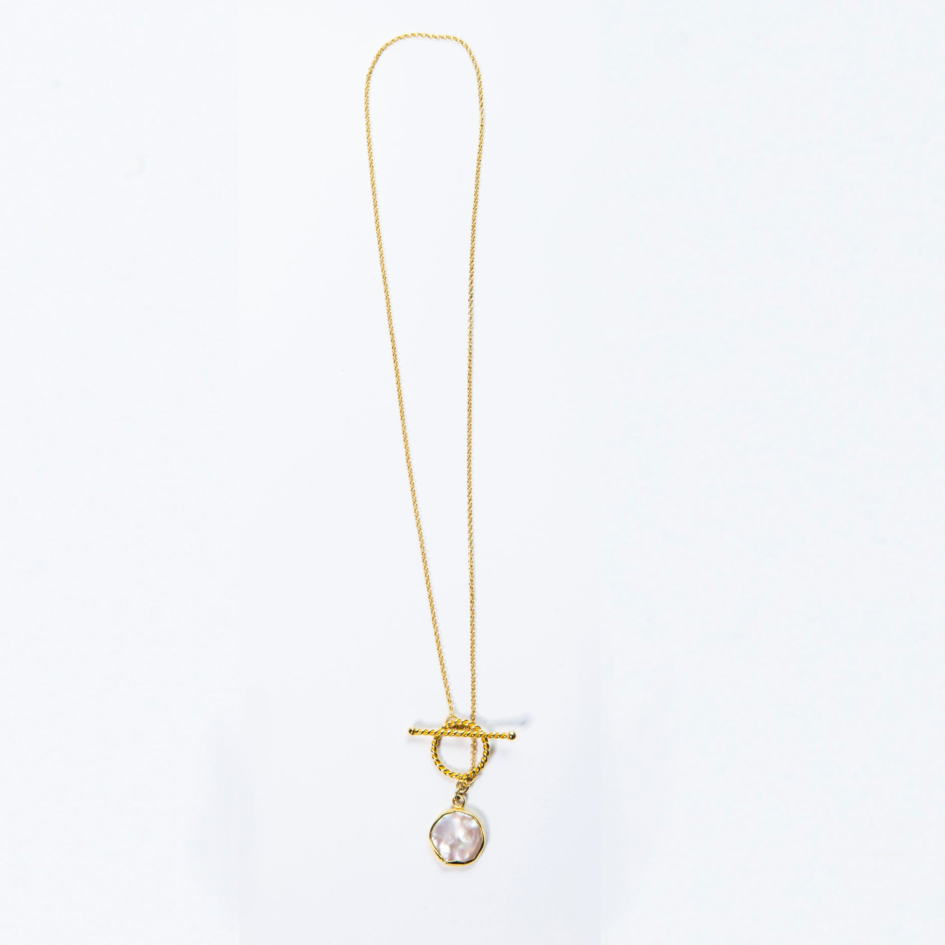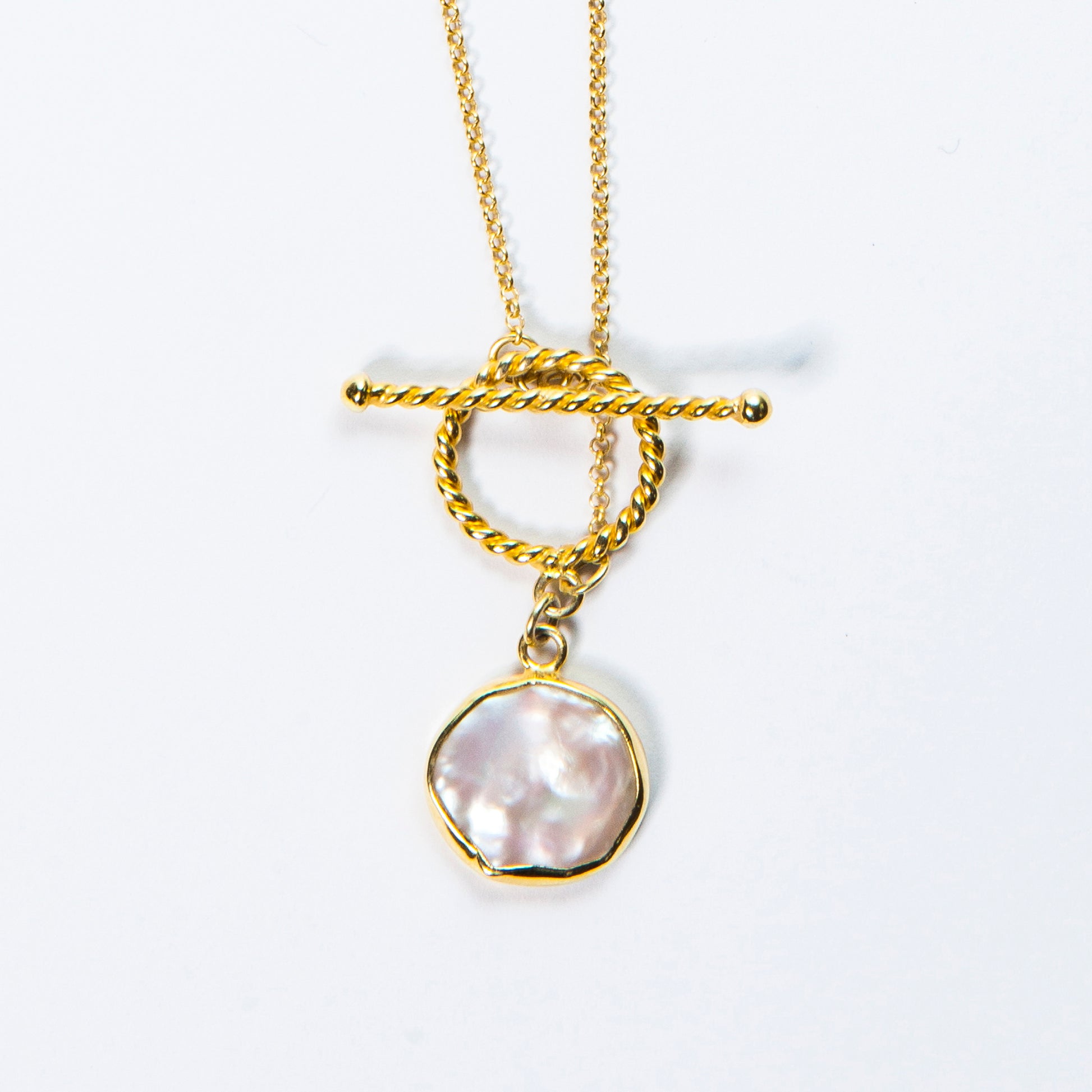 This Gold Pearl Front Fasten T Bar Necklace is a luxurious everyday essential. Perfectly crafted in sterling silver 925 with 18kt gold vermeil, it features a keshi pearl for a stylish hint of sparkle. An exquisite combination of delicacy and modernity, this necklace is sure to become a timeless addition to any wardrobe.